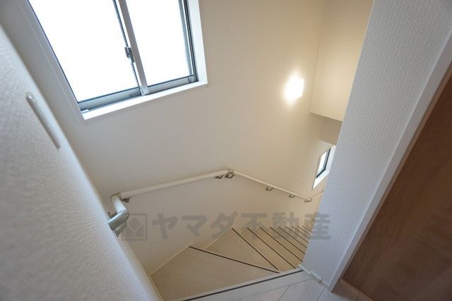 同仕様写真。小さなお子様やご高齢の方でも安心できる、手すり付き階段。段差も低めで設定されており、安全性にも優れています。