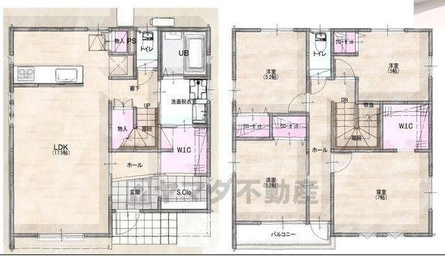 LDK17.5畳(1F)、洋5畳(2F)、洋5.2畳(2F)、洋7畳(2F) |