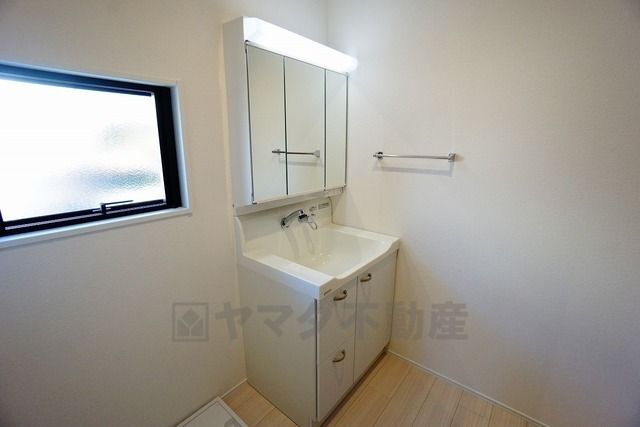 同仕様写真。三面鏡裏収納付き洗面化粧台です^^ 歯磨きセットやスキンケア用品などの収納に便利ですね。 生活感も隠すことができ、来客時にも安心です。