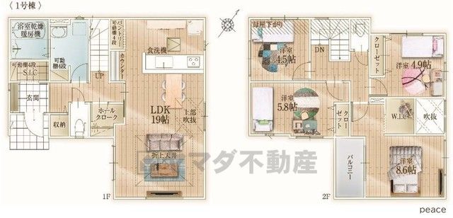 LDK19畳(1F)、洋4.5畳(2F)、洋4.9畳(2F)、洋5.8畳(2F)、洋8.6畳(2F) |