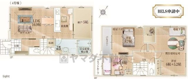 LDK16.9畳(1F)、その他5畳(1F)、洋4.6畳(2F)、洋5.2畳(2F)、洋6畳(2F)、洋8.7畳(2F) |