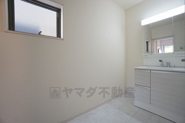 同仕様写真。三面鏡つき洗面台。収納も一体型になっているので、ドライヤーやヘアアイロンの置き場に困りません。