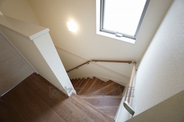 同仕様写真。お子様も高齢の方も安心して上り下りができる手摺がついた安心設計です。 階段には小窓を配置しました。日中でも暗くなりがちな階段下が明るくなり安全ですね。