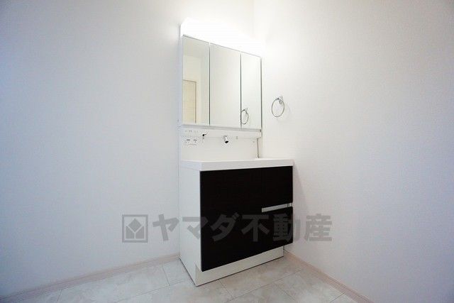 同仕様写真。三面鏡裏収納付き洗面化粧台です^^ 歯磨きセットやスキンケア用品などの収納に便利ですね。 生活感も隠すことができ、来客時にも安心です。