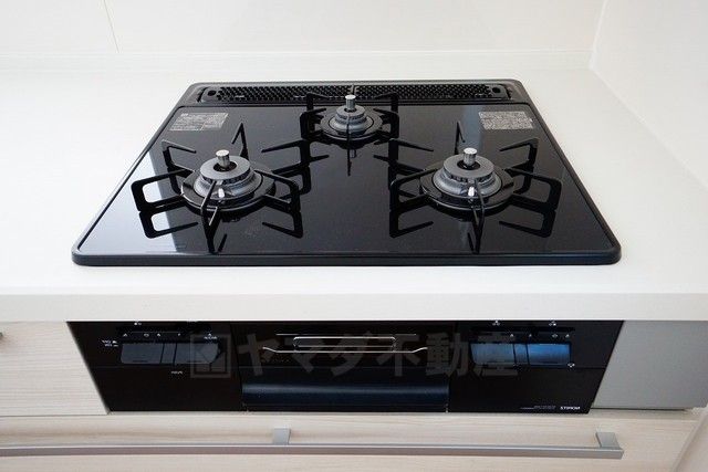 同仕様写真。同時にたくさんの料理が調理できる3口コンロ。長時間熱を通しておきたい煮込み料理を作りながら、炒め物など同時進行で進められます。