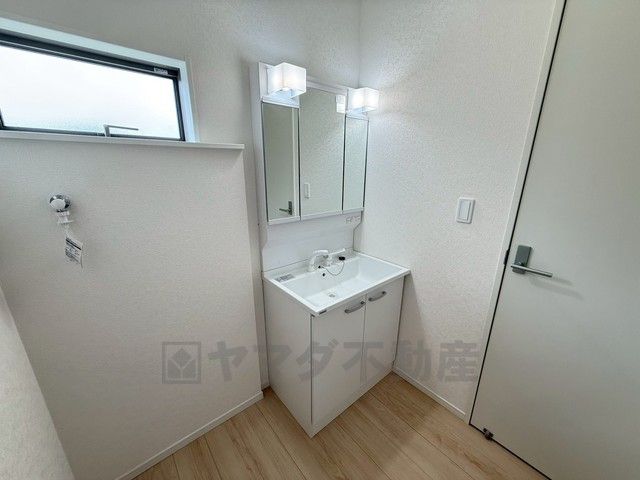三面鏡つき洗面台。鏡裏にたっぷりとした収納スペースがあります。鏡を閉めてしまえば小物は見えないため、スッキリとした印象の洗面台にできます。