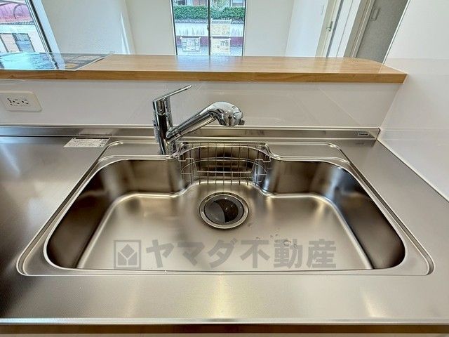 広々としたステンレスシンクには、洗剤やスポンジを収納出来るラック付き。広さも確保しているので、大きなお鍋も洗いやすいです。