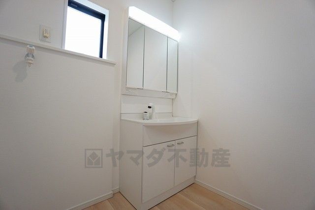 同仕様写真。三面鏡つき洗面台。鏡裏にたっぷりとした収納スペースがあります。鏡を閉めてしまえば小物は見えないため、スッキリとした印象の洗面台にできます。