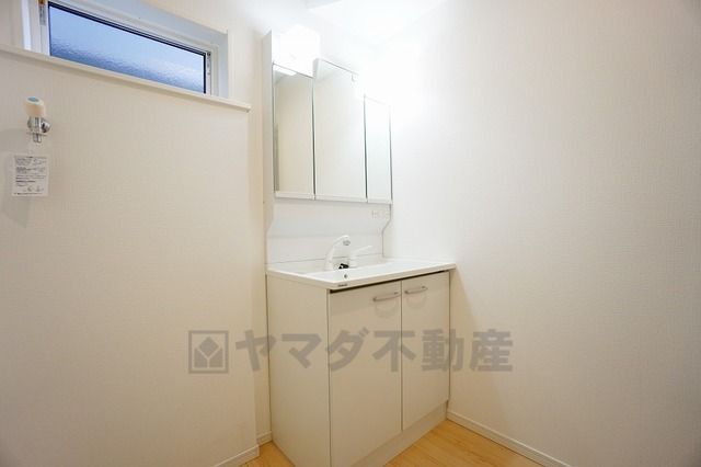 三面鏡つき洗面台。鏡裏にたっぷりとした収納スペースがあります。鏡を閉めてしまえば小物は見えないため、スッキリとした印象の洗面台にできます。
