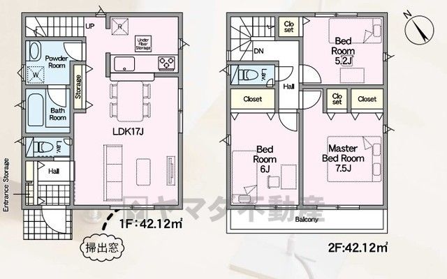 LDK17畳(1F)、洋5.2畳(2F)、洋6畳(2F)、洋7.5畳(2F) |