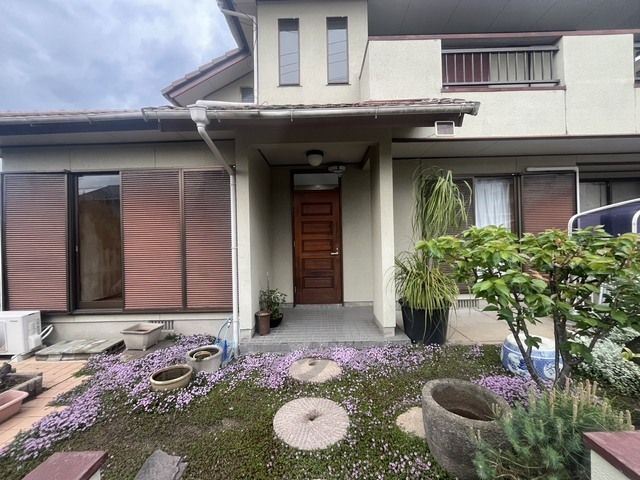 落ち着いた外観が印象的な住まい。植栽が彩るアプローチは季節の移ろいを感じられ、帰宅するたびに安らぎを感じられる空間です。