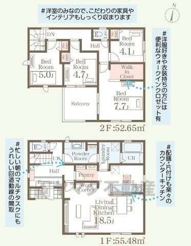 LDK18.5畳(1F)、洋4.1畳(2F)、洋4.7畳(2F)、洋5畳(2F)、洋7.7畳(2F) |