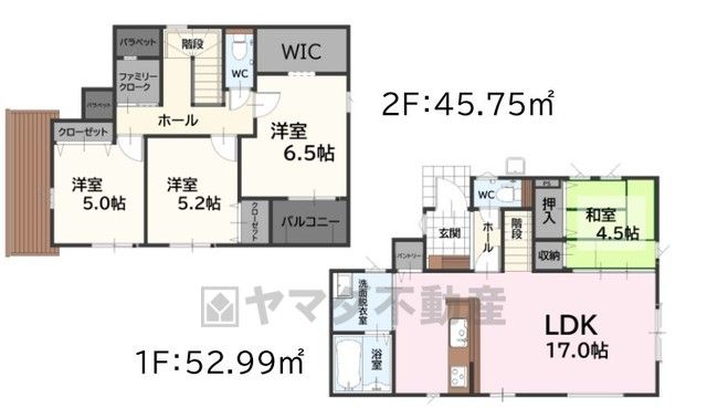 LDK17畳(1F)、和4.5畳(1F)、洋5畳(2F)、洋5.2畳(2F)、洋6.5畳(2F) |