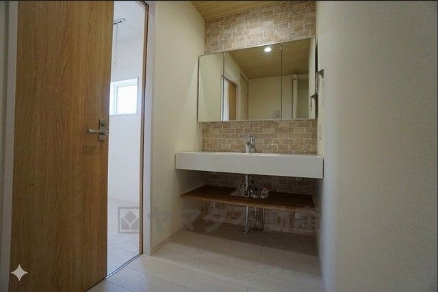 同仕様写真。三面鏡裏収納付き洗面化粧台です^^ 歯磨きセットやスキンケア用品などの収納に便利ですね。 生活感も隠すことができ、来客時にも安心です。