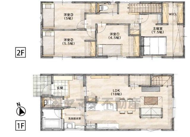 LDK18畳(1F)、洋4.5畳(2F)、洋5.5畳(2F)、洋5畳(2F)、洋7.5畳(2F) |